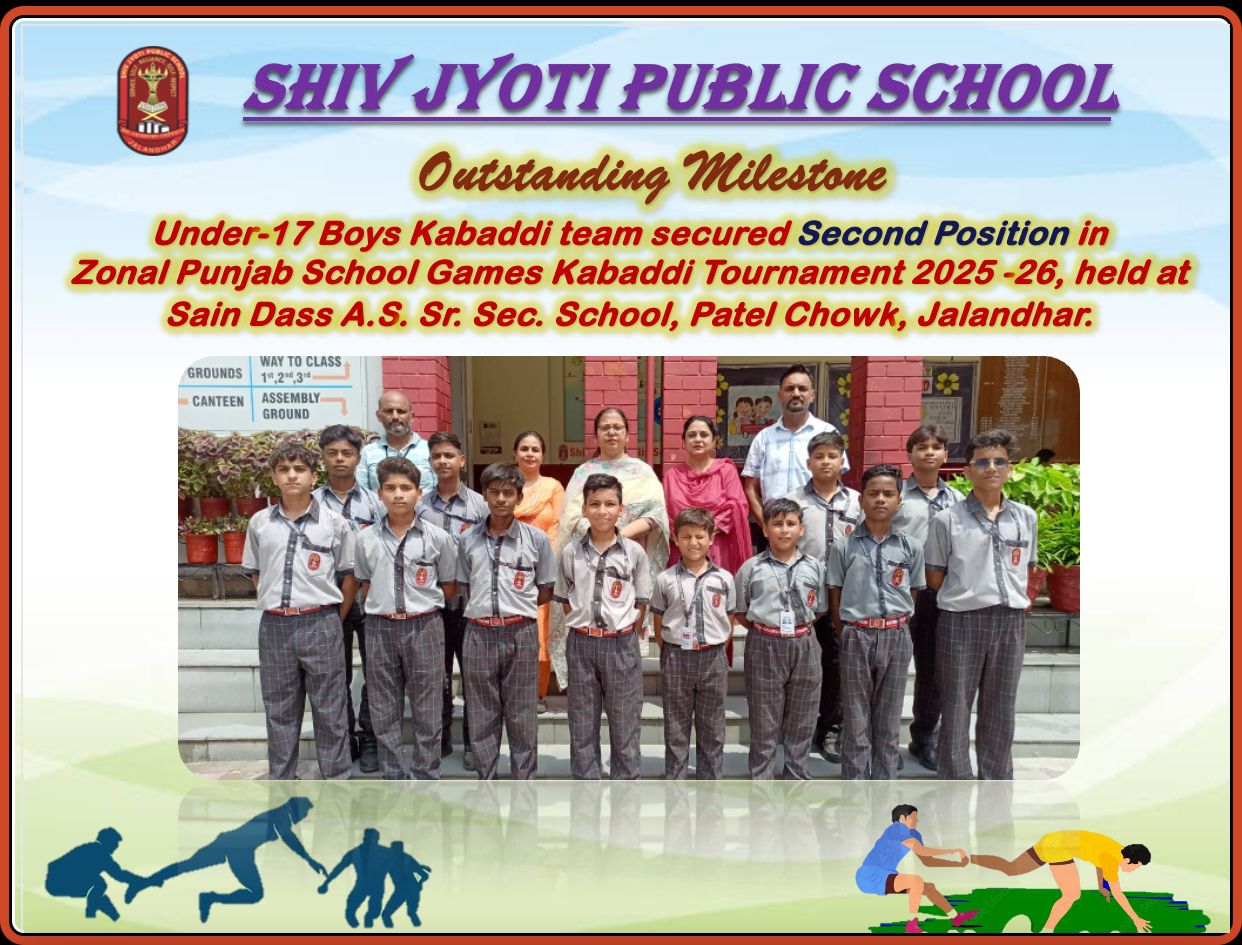 इन खिलाड़ियों ने नेशनल स्टाइल में ‘ज़ोनल कबड्डी टूर्नामेंट’ में अपना दमखम दिखाते हुए दूसरा स्थान प्राप्त किया। डॉ. विदुर ज्योति,चेयरमैन ट्रस्ट, डॉ. सुविक्रम ज्योति, चेयरमैन कम मैनेजर, मैनेजिंग कमेटी; जनरल सैक्रेटरी ट्रस्ट, प्रधानाचार्या प्रवीण सैली, उपप्रधानाचार्या रमनदीप तथा सहायक उपप्रधानाचार्या ममता अरोड़ा ने विजेताओं को हार्दिक बधाई दी।