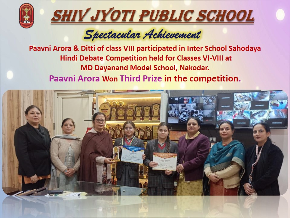 कुल 28 टीमों के 56 प्रतिभागियों के साथ तर्क-वितर्क करते हुए हमारी दोनों छात्राओं ने भी दिए गए विषय के पक्ष और विपक्ष में अपने विचार मंच पर साँझा किए। निर्णायकों के प्रश्नों के सार्थक तर्कों के साथ उत्तर देकर पावनी अरोड़ा ने उन्हें प्रभावित व संतुष्ट करके प्रतियोगिता में तीसरा स्थान प्राप्त किया। इस अवसर पर प्रधानाचार्या प्रवीण सैली ने प्रतिभागियों की सराहना की तथा विशेष रूप से विजेता छात्रा पावनी अरोड़ा को हार्दिक बधाई दी। उन्होंने पावनी का उत्साहवर्धन करते हुए बताया कि ऐसे प्रतिभावान विद्यार्थी विद्यालय का गौरव बढ़ाते हैं।